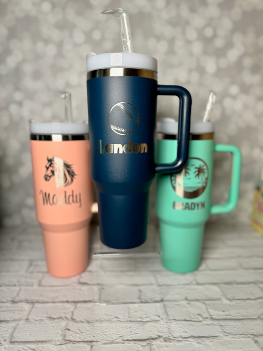 Laser Engraved Stanley Style 40 ounce Stainless Steel Insulated Tumbler with Handle and Lid with Straw Hole, Purple