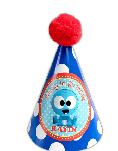 Dress up your baby and all of your party guests with these precious, original party hats. Arrive fully assembled with Fuzzy pompom on top and custom decal applied. Ink is permanent, no smearing.