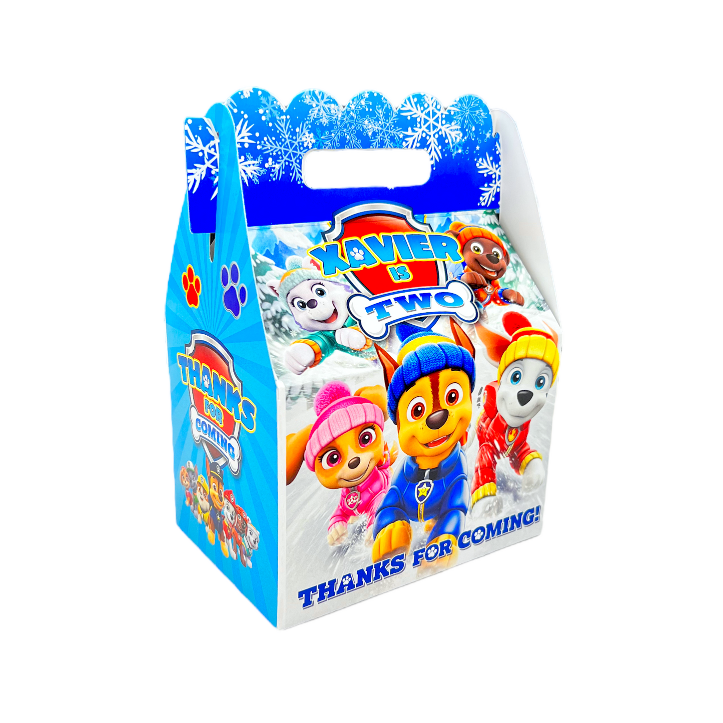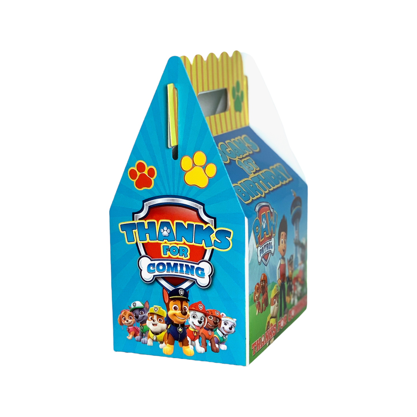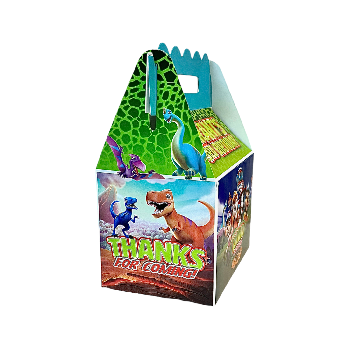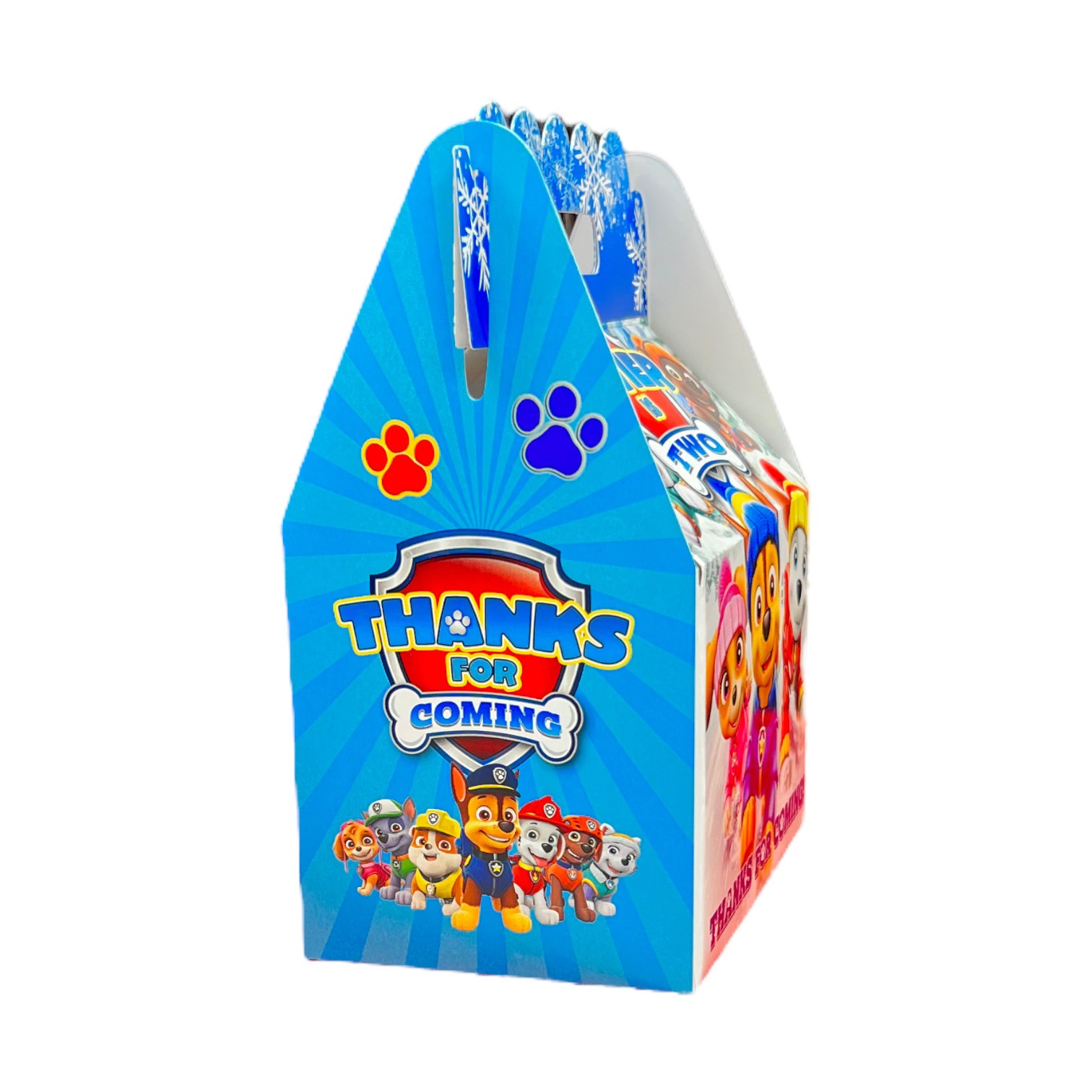 Delight your guests and thank them for celebrating with our fully custom printed gable favor boxes. They are the perfect goody bags for take-home treats, adding a decorative accent to your party tables. We can match the artwork and colors to your theme—just include your requests. Ideal for cookies, snacks, small toys, and candy. Sold empty, shipped flat, with simple pop-up assembly. Make your event unforgettable with these charming favor boxes! Approximately 5.5" wide, 6.75" tall, 3.5" deep. Minimum order 8 boxes, increments of 4.