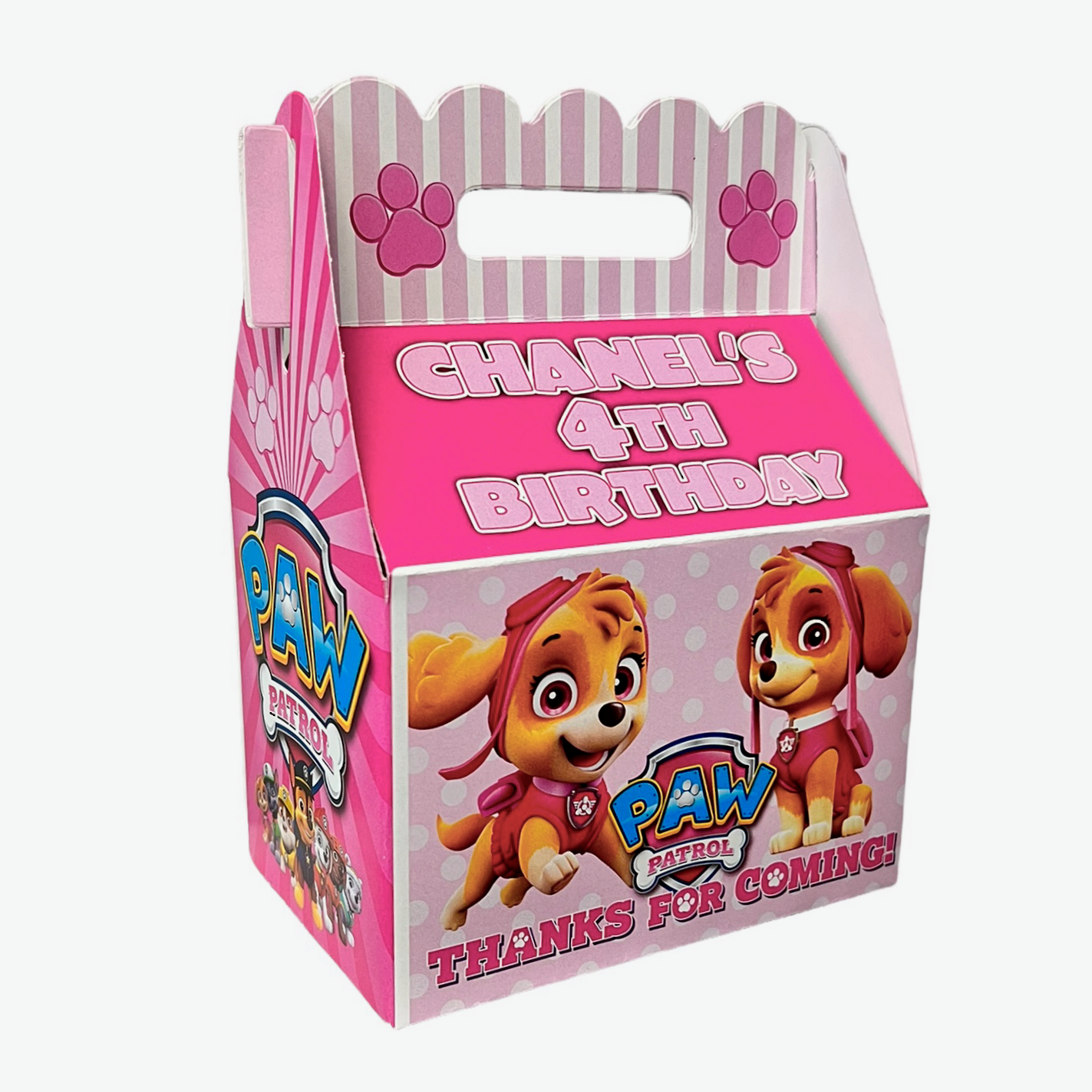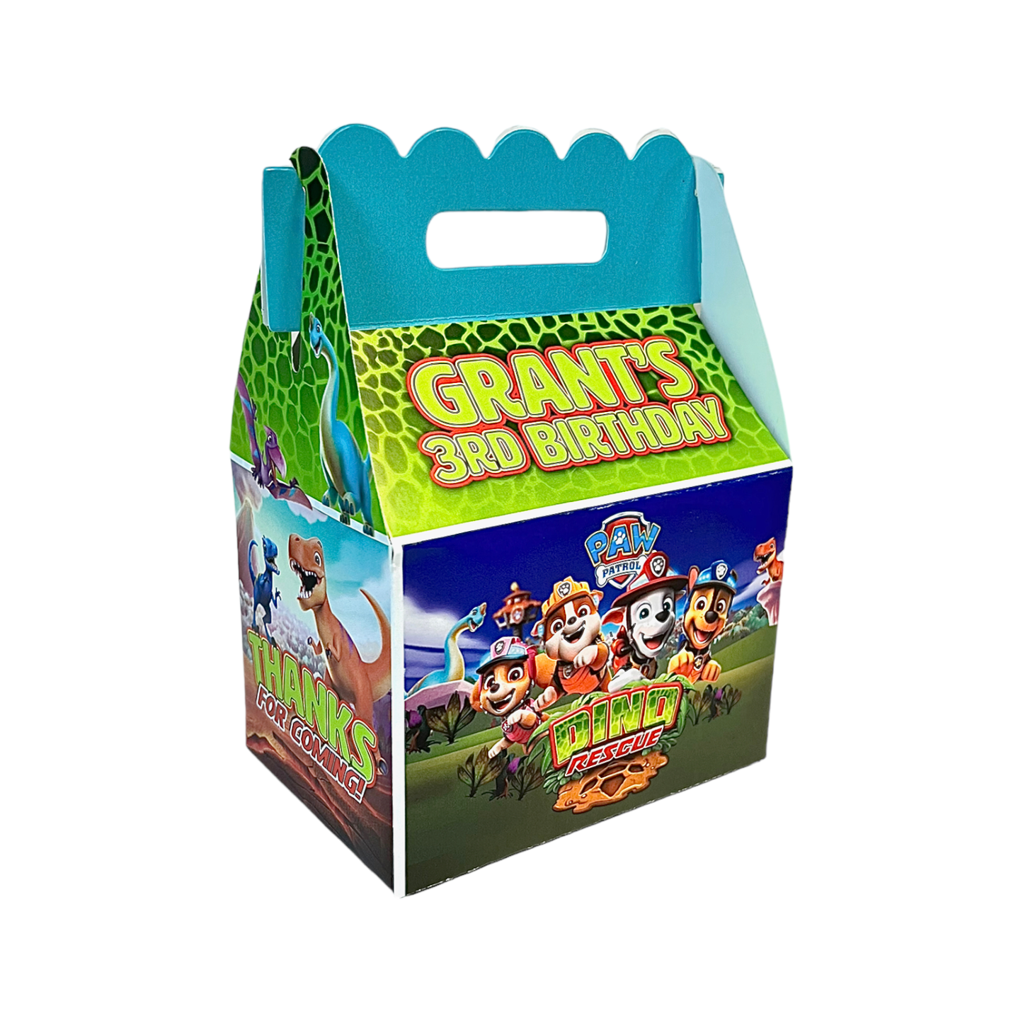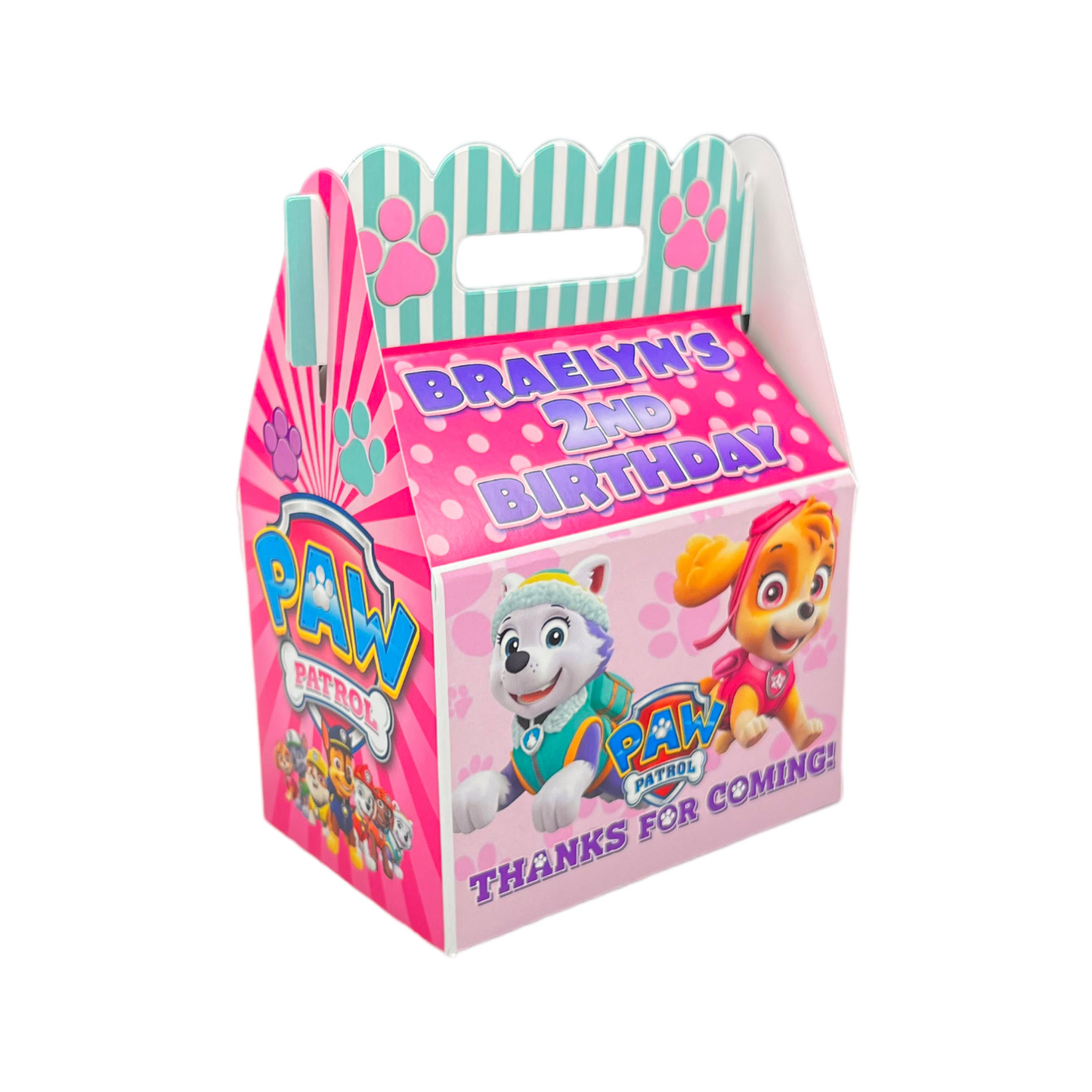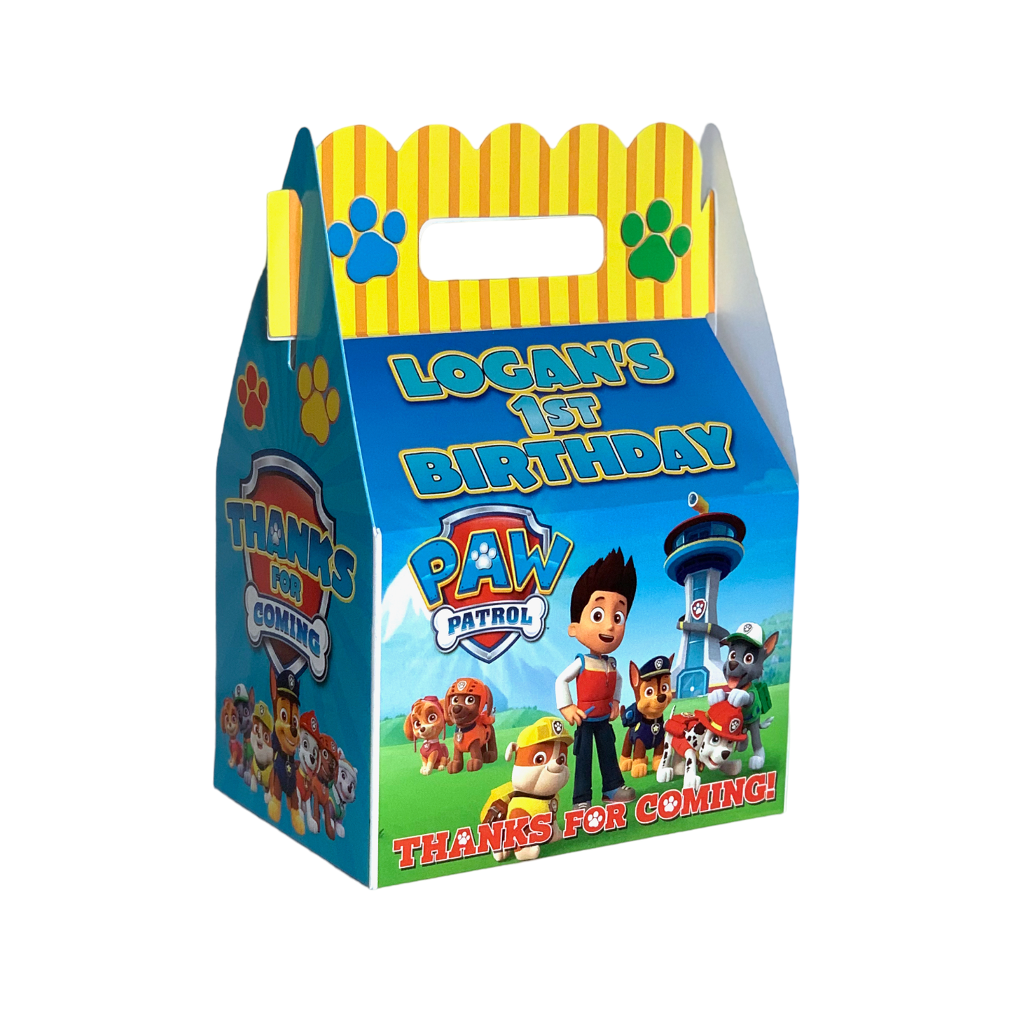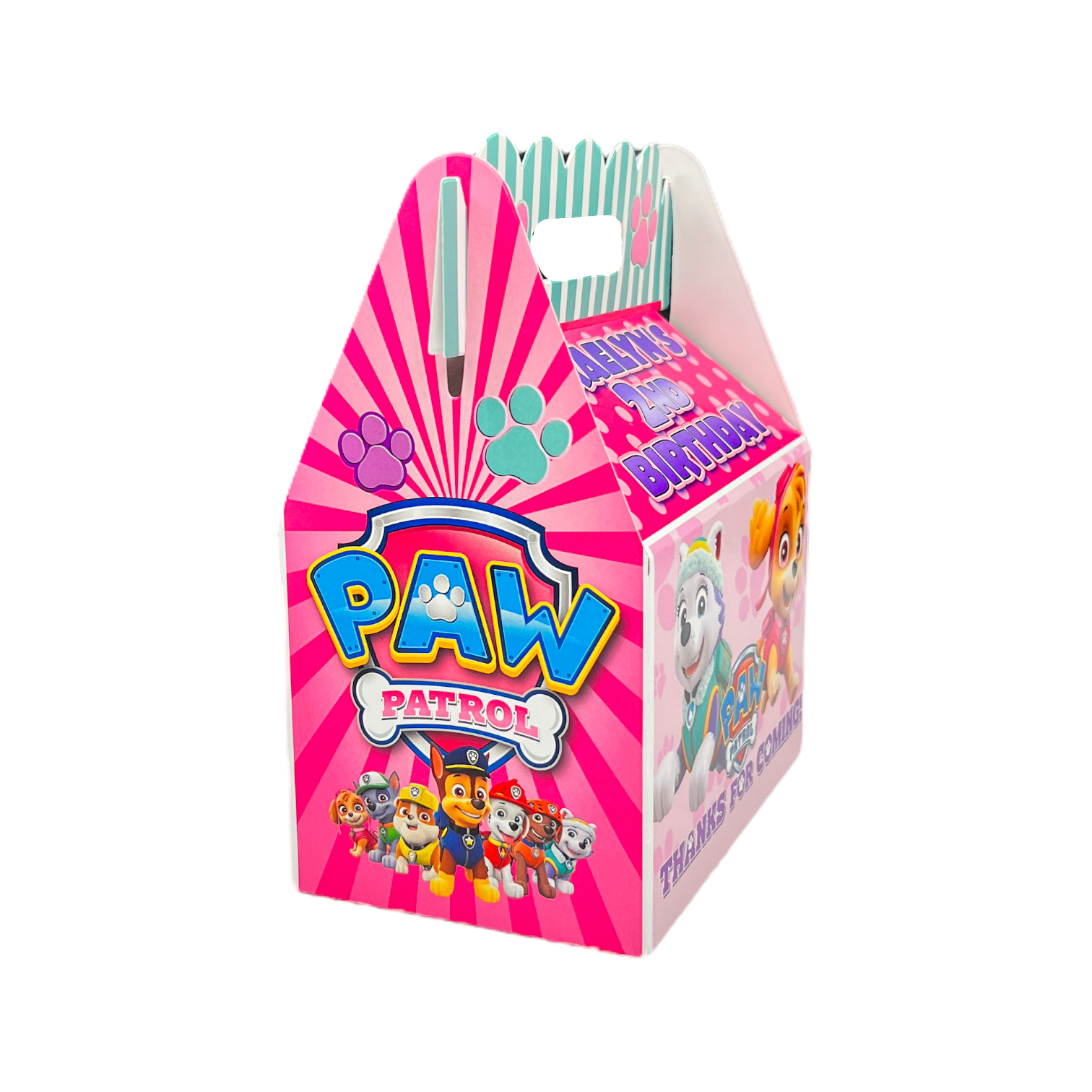 Delight your guests and thank them for celebrating with our fully custom printed gable favor boxes. They are the perfect goody bags for take-home treats, adding a decorative accent to your party tables. We can match the artwork and colors to your theme—just include your requests. Ideal for cookies, snacks, small toys, and candy. Sold empty, shipped flat, with simple pop-up assembly. Make your event unforgettable with these charming favor boxes! Approximately 5.5" wide, 6.75" tall, 3.5" deep. Minimum order 8 boxes, increments of 4.