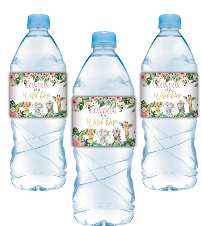 Wild One Jungle Animals Floral Birthday Party PACK of 15 Water Bottle Labels